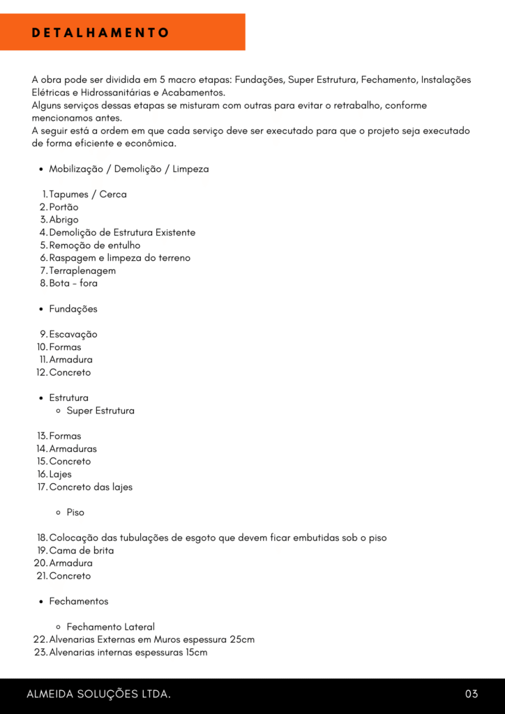 Descritivo detalhado de todo o projeto, serviços e especificações de materiais.