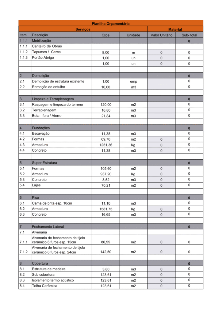 Planilha com o levantamento de cada serviço necessário para executar o projeto e suas respectivas qualidades.