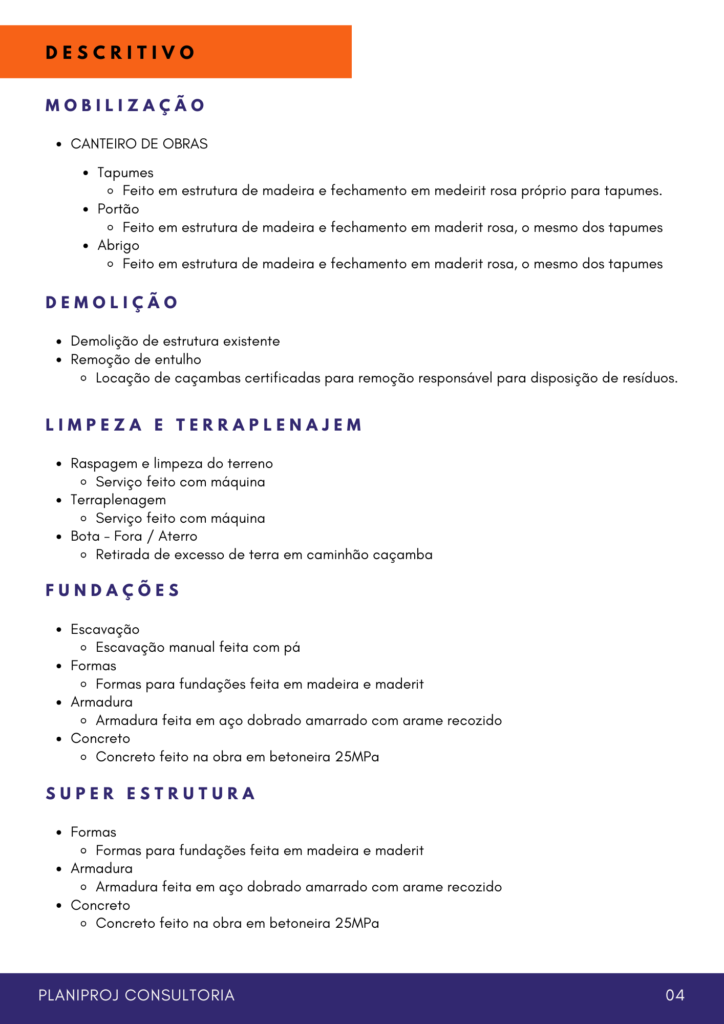 Esta é uma amostra de Memorial Descritivo. Um Memorial Descritivo é um documento que descreve como devem ser executados os trabalhos da obra para que estejam dentro das normas técnicas e também de acordo com as especificações de projeto. Quanto mais detalhados os projetos mais detalhado fica o memorial. Este é somente um exemplo, de um projeto básico sem muito detalhamento e sem projetos complementares, porém é possível ver que tipo de documento é produzido quando se contrata este tipo de serviço.